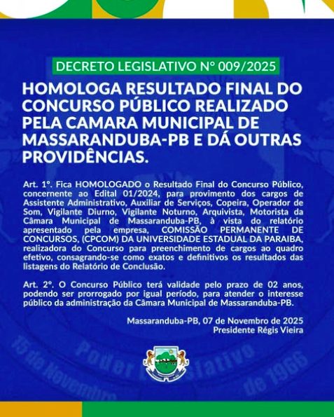 A Câmara Municipal de Massaranduba-PB homologa o resultado final do Concurso Público referente ao Edital…